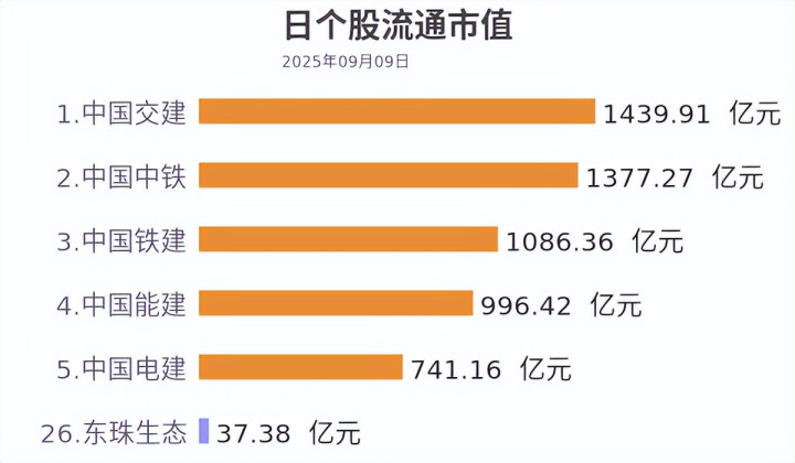 根据日个股流通市值排序,东珠生态的日个股流通市值为37.38亿元,在基础建设行业中,排名第26,排名前三位的分别是:中国交建,中国中铁,中国铁建。