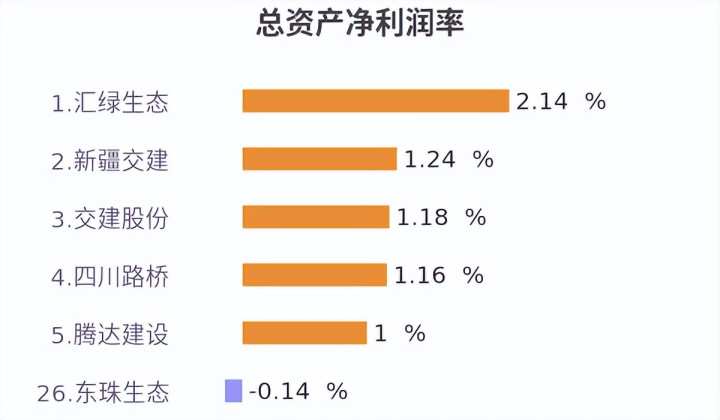 根据总资产净利润率排序,东珠生态的总资产净利润率为-0.14%,在基础建设行业中,排名第26,排名前三位的分别是:汇绿生态,新疆交建,交建股份。