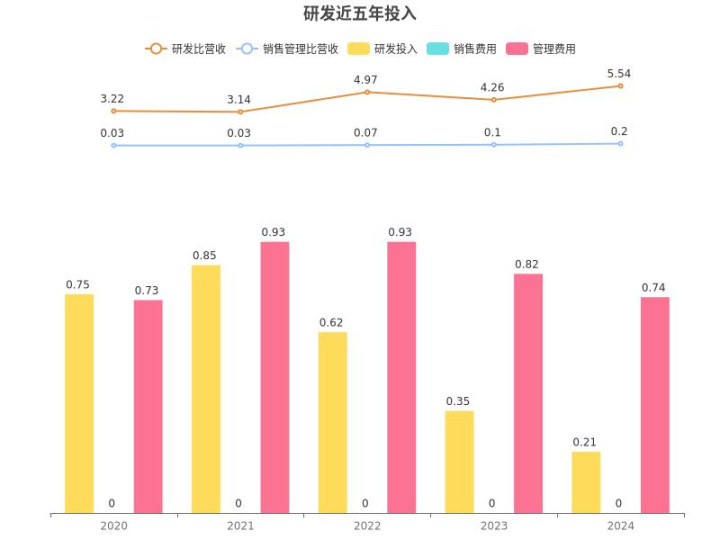 近五年,东珠生态研发投入不及销售和管理费用,近五年研发投入为2.78亿,研发占营业收入比率从2020年的3.22%提升到2024年5.54%。
